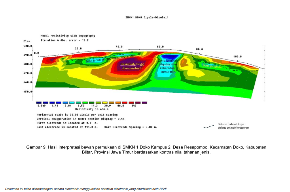 Hasil pengukuran bawah permukaan menunjukkan adanya lapisan tanah yang jenuh air pada kedalaman tertentu. Lapisan ini berpotensi menjadi bidang gelincir yang dapat memicu longsor susulan. Pada penelitian tersebut prediksi bidang glincir yakni antara 5 meter – 12 meter di bawah permukaan tanah. - Dampak Potensial